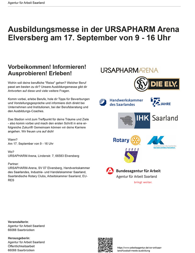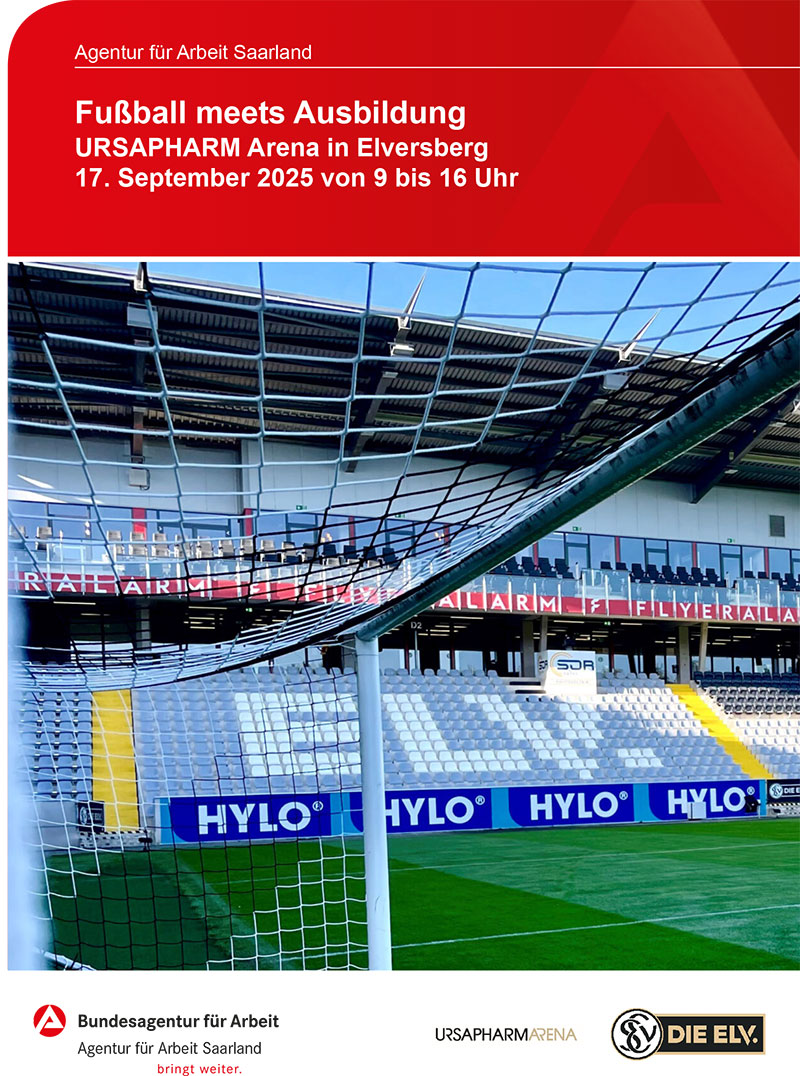 Diese Chance bietet dir die zweite saarlandweite Ausbildungsmesse der Agentur für Arbeit Saarland in Kooperation mit der SV 07 Elversberg am 17. September 2025 von 09 - 16 Uhr in der Ursapharm Arena Elversberg.
